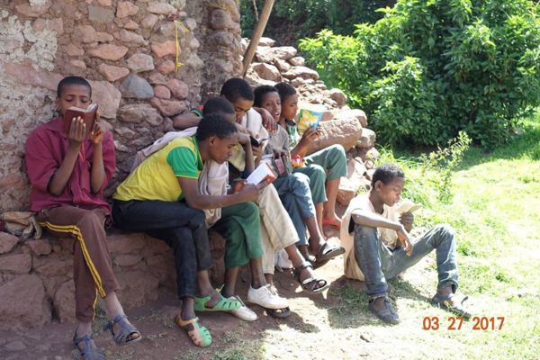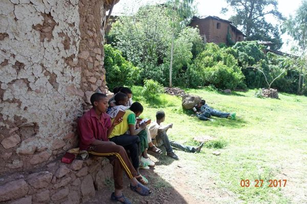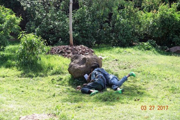 看到這一幕,不論我有幾層下巴,也都驚掉了! 這群孩子全在念書(讀經)ㄝ!注意看,石頭後面俯趴的兩個小孩也在看書!