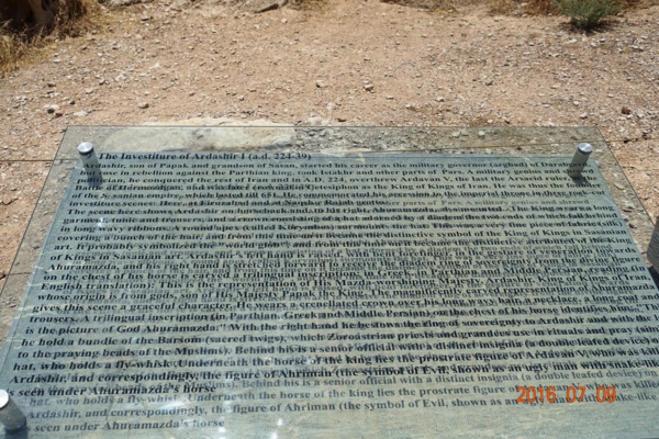 這面Ardašir I 的受階浮雕非常重要,因為它標誌著薩珊帝國的開始。其上的一個銘文說Ardašir承認他背叛了對阿塔巴努斯國王Artabanus V的承諾(波斯人曾經是Arsacid Parthians帕提亞帝國=安息帝國的附庸國),但他的行動完全合法,理由是因為阿胡拉馬茲達要他這麼做的。同時,這也是Ērān伊朗這個詞出現的最古老證據,在這個雙語的銘文中,Ardašir稱自己為“伊朗國王之王阿爾達希爾”( "Ardashir, king of kings of the Iranians")