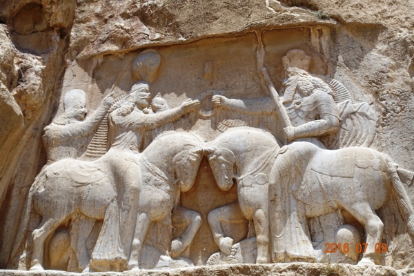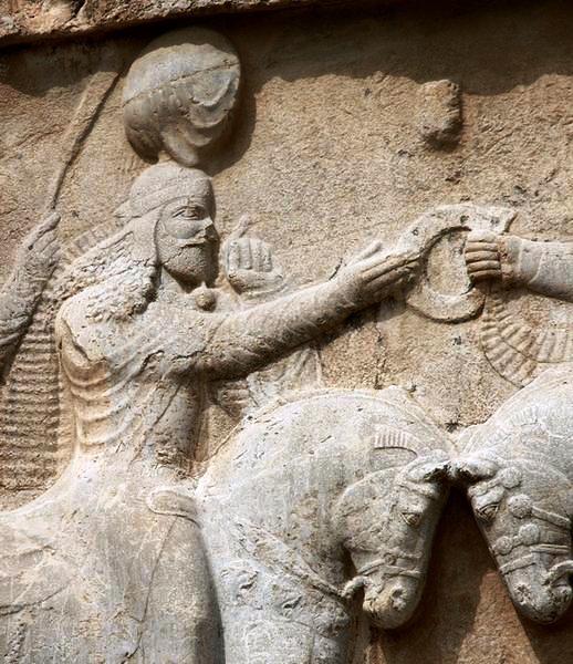 在右邊,我們可以看到阿胡瑪茲達Ahuramazda,他正在向左邊的阿爾達希爾Ardašir(薩珊王朝Sassanid的創始人)交出戒指(這個戒指通常被稱為cydaris,是力量的象徵。--今天結婚典禮上男女雙方交換婚戒的儀式,據說也是由此而來。)這兩個人物都可以用他們頭上的冠來識別。
