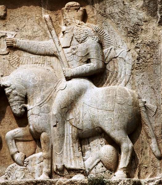 Ardashir和 Ahuramazda坐在馬上,阿爾達西爾的馬下是阿塔巴努斯國王king Artabanus--帕提亞帝國的最後一位統治者【A】;而阿胡拉馬茲達的馬蹄下則是魔鬼阿里曼Ahriman (Angra Mainyu)【B】。-網圖