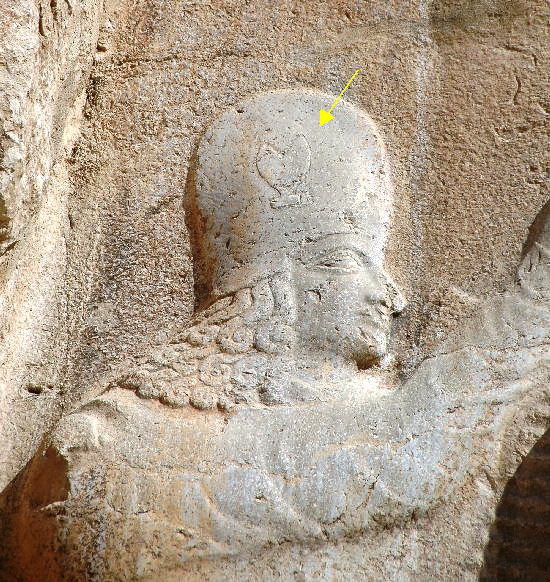 Ardashir他的頭上有一個大球,它被稱為korymbos--這是薩珊國王專屬的一種頭飾(它其實是由在頭頂部凸起的髮髻所組成),後來我們往往由此來識別雕像人物的身分!。