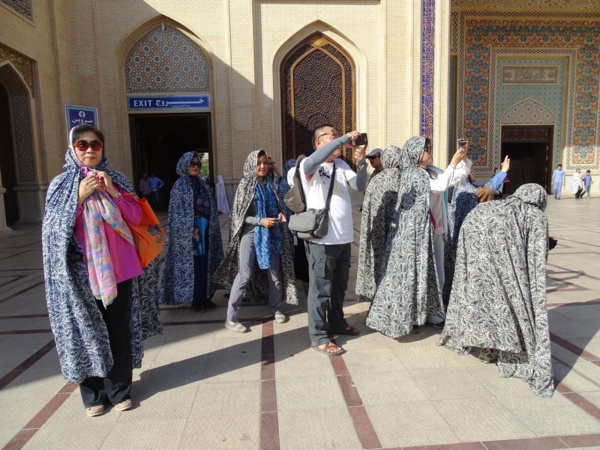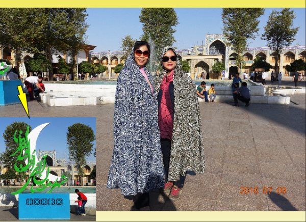 這張照片很有趣:大夥穿好了恰朵出來 ,不知看到了什麼 ,一陣猛拍! 尤其是置中的 領隊趙先生,他雖然來伊朗無數次了,但能獲准進入此地的機會畢竟不多,所以他也是猛按快門! 至於我,則是一副開喜婆婆進城的樣子……!