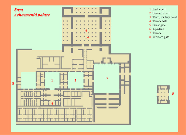 目前在蘇薩古城的現場只看到格局方正的牆基和石柱底座,連石塊都很少,因為原來殘存的磚石,都被十九世紀時的法國考古隊拿去建了一座防禦性城堡(且作為工作房),稱為蘇薩城堡。