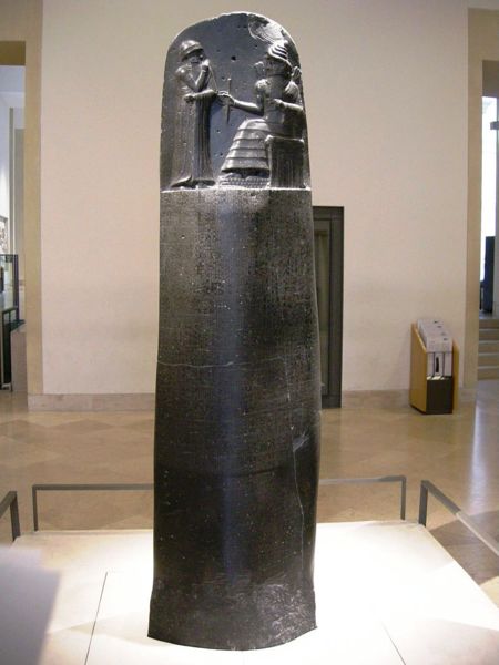 《漢摩拉比法典》the Law Code of Hammurabi是古巴比倫第六代國王漢摩拉比頒布的一部法律,被認為是世界上迄今為止保存最完整和最早的成文法典--約於公元前1754年頒布。 1901年在埃蘭古城--蘇薩發現,為一黑色的玄武岩圓柱,高達兩米多,現存法國巴黎羅浮宮博物館。(網圖)