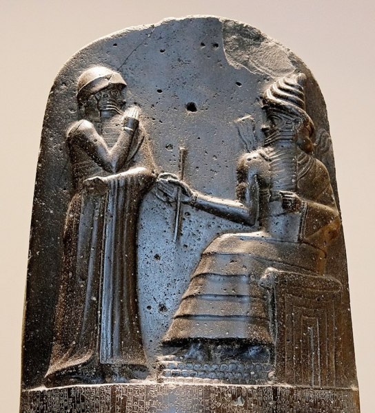 漢摩拉比法典的圓柱上端有漢摩拉比從太陽神夏馬修(Shamash)手中接過權杖的浮雕。站著的是漢摩拉比王,坐著的是巴比倫的民族神及太陽神-夏馬修,正在向漢摩拉比擺著傳授甚麼大道理的姿勢。(網圖)