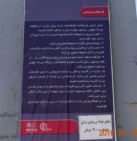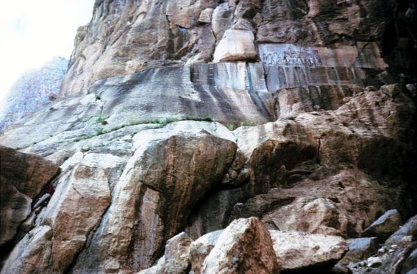 大流士當年在這裡製作銘文以記錄自己的豐功偉績,是因為這裡有3個得天獨厚的條件:1.這裡是交通要道--是古代伊朗高原通往美索不達米亞的主要貿易道路(哈馬丹和巴比倫之間古絲綢之路的骨幹);2.在這座山崖之下,有一道終年不竭的清泉,自古以來就成為過往行旅休息之地,人們在此稍事休息之際,一抬頭就會看到山崖上的銘文;3.這是大流士最在意的一點--這裡的山崖非常險峻,無論是步行或攀爬都極難到達,因此絕對不會有人破壞這些重要的石刻。