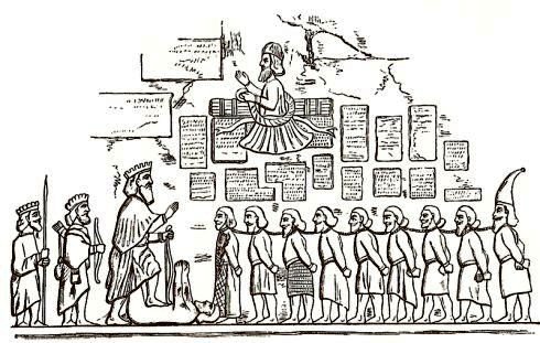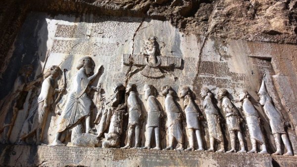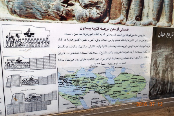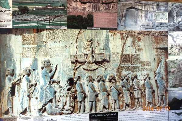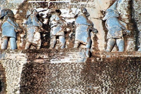 *浮雕四周有大約1200行的銘文,敘述大流士繼承王位的正統性,和對抗叛亂官員的征戰實錄。--網圖