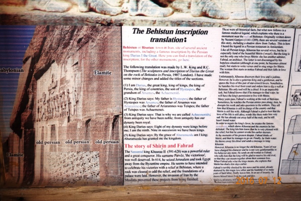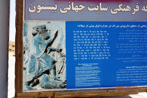 銘文是由大流世一世於西元前521年下令鑿刻的,用了三種古老的楔型文字寫成:古埃蘭文、古巴比倫文、古波斯文。內容完全一樣,記載波斯國王大流世一世成為國王之後,在一年多時間內進行十九場戰役,擒獲謀反的九位國王。--網圖