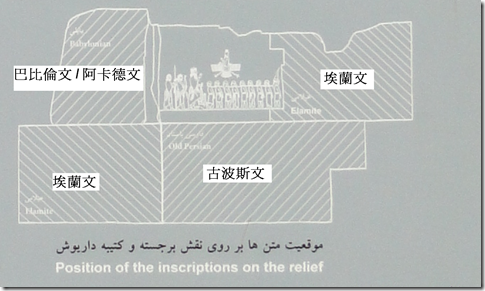 整篇銘文以三種不同的楔形文字寫成:古波斯語(有414行)、埃蘭語(有593行)及巴比倫語(一種後期的阿卡德語,有112行)。巴比倫語不像古波斯語,屬閃米特語族。因此,此石刻有如羅塞塔石碑之於於埃及象形文字一樣,大力地幫助了專家們破解楔形文字。--網圖