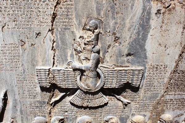 位在浮雕正中最顯眼位置的就是智慧與善良之神阿胡拉馬茲達。銘文中這位尊神的名字被提到了76次,就不難看出在大流士心中這位尊神的顯赫地位。--網圖