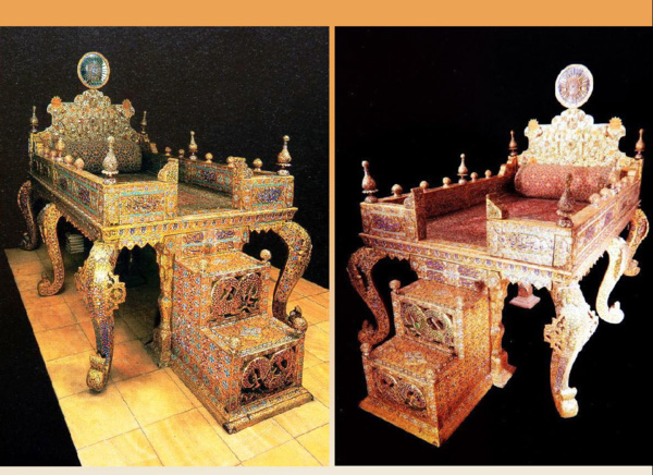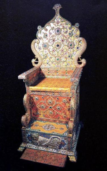 波斯文化中王座都是長方形,不像是平常的椅子,因為波斯語中王座的字是「Takht」,指的是「榻」,可以是床榻也可以是休憩用的高腳坐榻。(大家在波斯花園中常會看到,通常是木製的)。