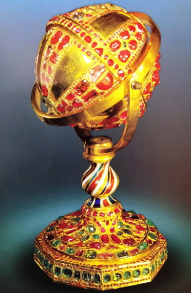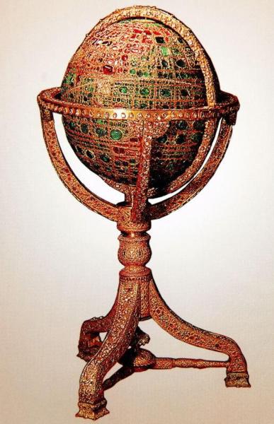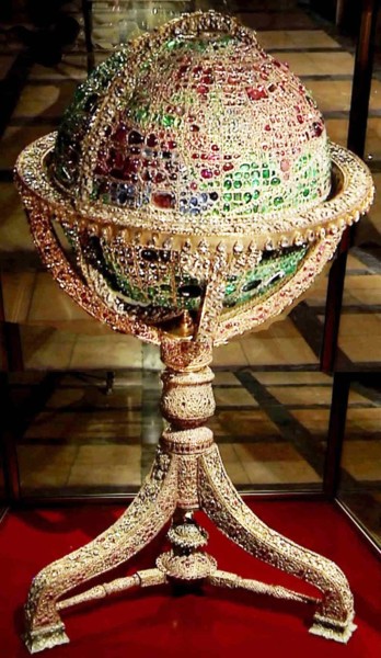 這是個用34公斤黃金製作的純金地球儀,直徑65cm,高110cm,製作於1869年。球體上共鑲有5.1萬顆寶石:其中大洋、海域、湖泊用祖母綠鑲嵌(其中最大的祖母綠重175克拉),陸地用紅寶石和紅色尖晶石鑲嵌(其中最大的紅寶石重75克拉,最大的尖晶石重110克拉),撒哈拉以南的非洲地區和埃及用塊狀的藍寶石鑲嵌;伊朗,英,法和南亞的部分國家用鑽石鑲嵌,所鑲嵌的最大鑽石重約15克拉。大陸則用鑽石鑲嵌出輪廓,「地球儀」上標出了赤道和黃道,經線和緯線用紅寶石鑲嵌。