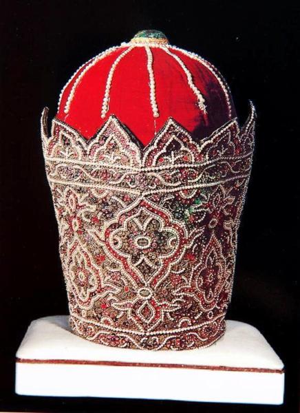 這是阿巴斯‧米爾扎Abbas Mirza的帽子 Abbas Mirza在世時一直為波斯卡扎爾王朝的儲君,因為他在未即位之前就去世了! 帽子由紅緞和天鵝絨布製成,頂部鑲有大顆祖母綠