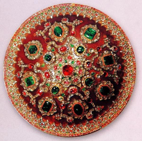 Nader Shah所用過的盾牌 盾牌用犀牛皮製成,表面鑲有鑽石,紅寶石,綠寶石和尖晶石。中心内徑的四顆綠寶石是用犀牛皮搓成的繩子穿孔釘在盾牌的表面,方便持盾者手持盾牌抵擋敵人(誰會真的拿這個盾牌去當防衛武器啊?)