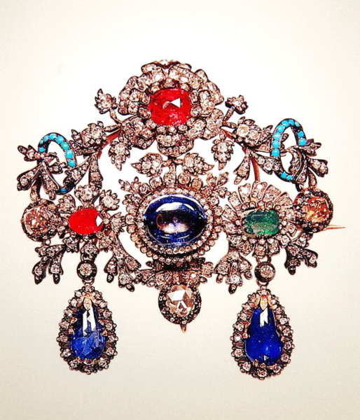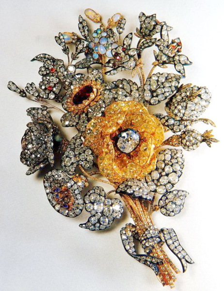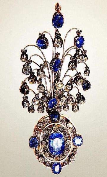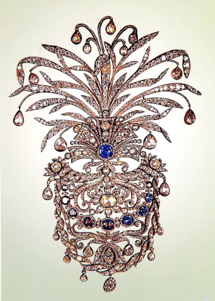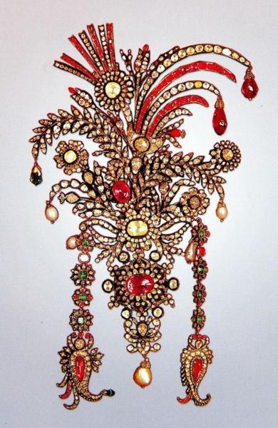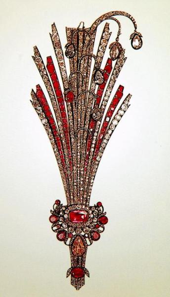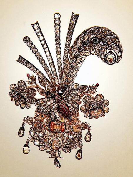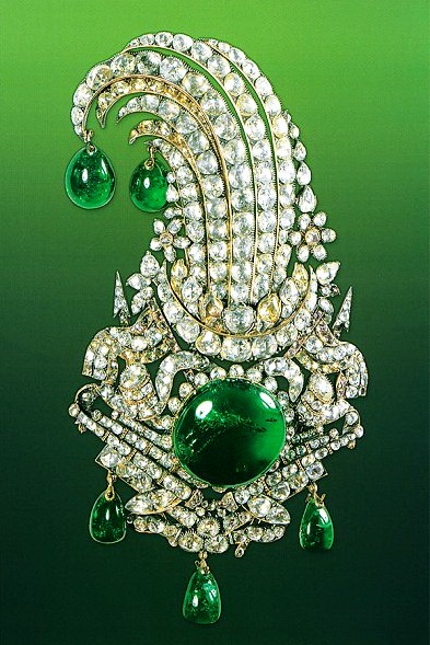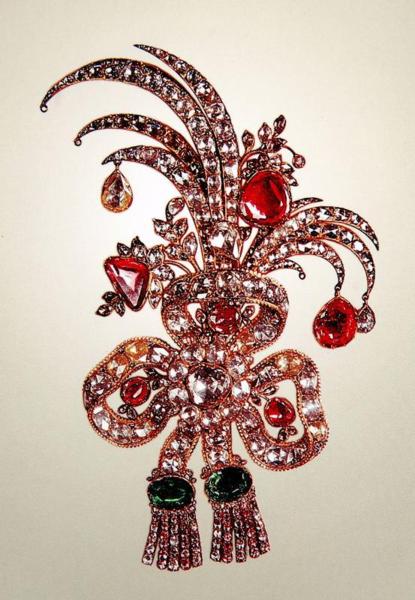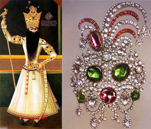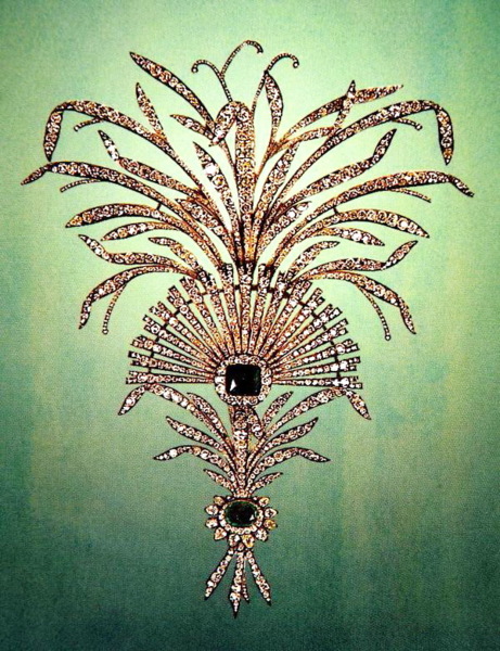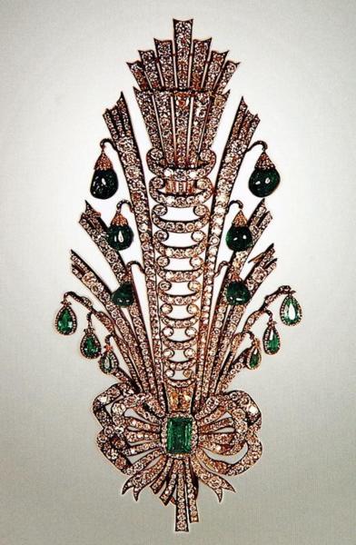 Reza Shah Pahlavi(巴勒維王朝的締造者)經常佩戴這套重781克拉的鑽石別針。(上面鑲有鑽石和祖母綠。)