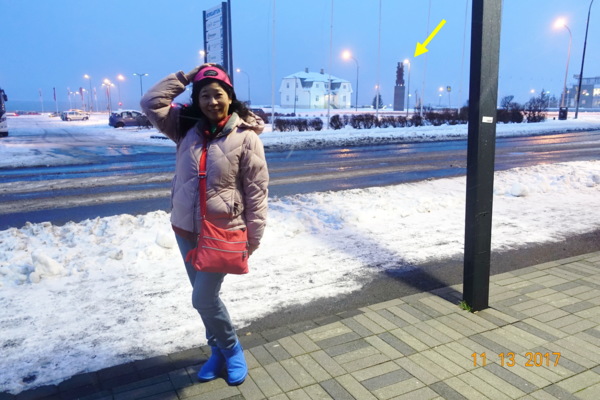 因為風雪實在太大,連跨過後方的這一條積了雪的馬路,我都幾乎要摔好幾次,遂放棄前往Hofdi House! (箭頭處的柱子見下文的說明)