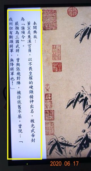 畫作中特別提到董宣、嚴顏二人,乃是在比喻竹子不畏霜雪的高節!