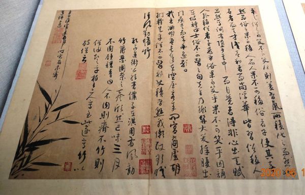 根據記載,本幀原與上一幀相連,後裁為二。題字滿幅,僅左下角畫細竹一叢,用筆勁力,構圖別緻!。