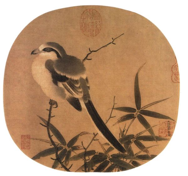 赭上加墨筆增添立體感。濃淡墨點畫伯勞輪廓,並渲染底色襯托白色部位。絲毛淡墨上加他色彩筆,豐富層次。多樣細膩的手法展現生意,確將北宋寫實至得神韻的風格帶入南宋。