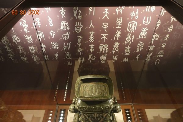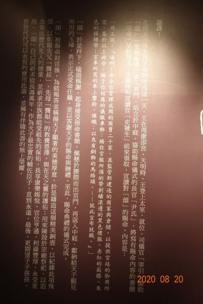 故宮十分貼心,將頌壺銘文的內容列印在文物後方的牆上,且每一個篆書的旁邊都有對照的正體楷書!