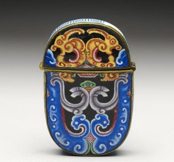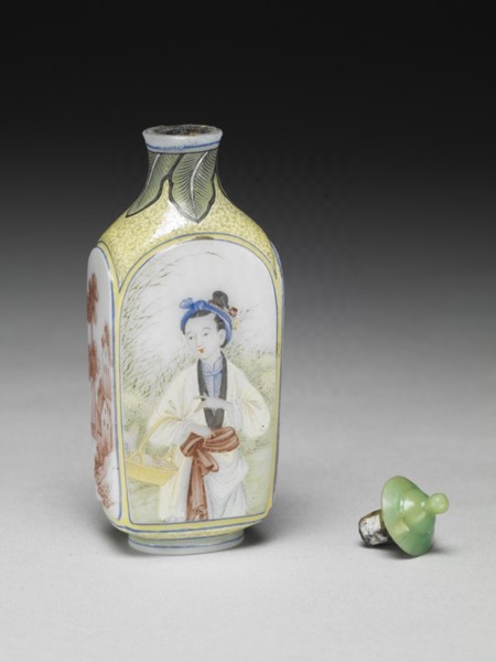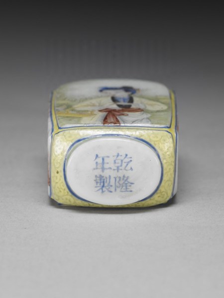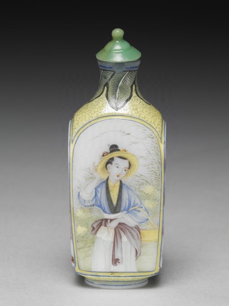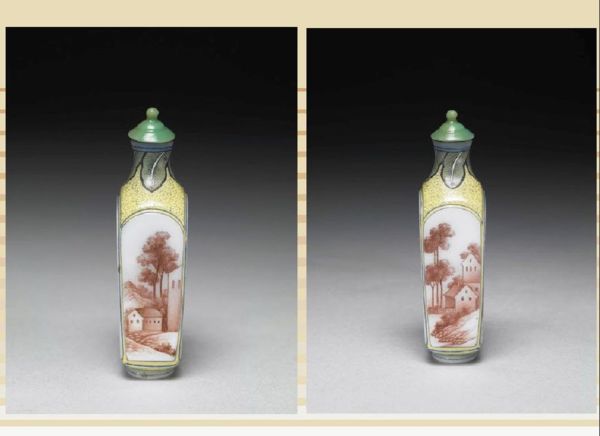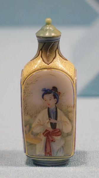 當初清宮的檔案所記為「呆白玻璃畫漁婆方鼻煙壺」,收於「乾清宮」中。(北京故宮也有一件相同者,存放在永壽宮。)