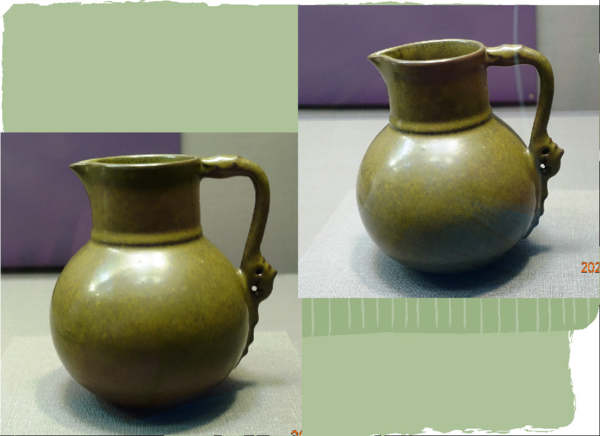 &此壺身上兩邊有兩蟠螭,其一回首張口為流,其二身軀圓拱為把;壺腹凸起有兩道弦紋,一側有繩結狀裝飾