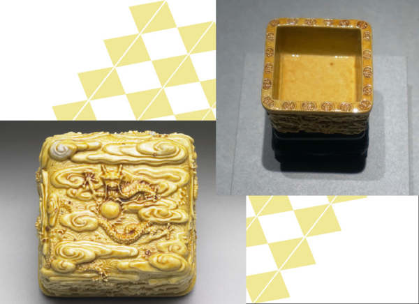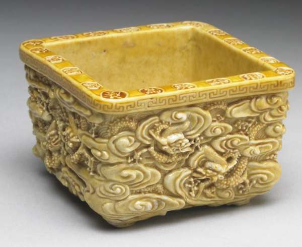 ※明 嬌黃凸雕九龍紋方盂「吳為製」款(網圖)