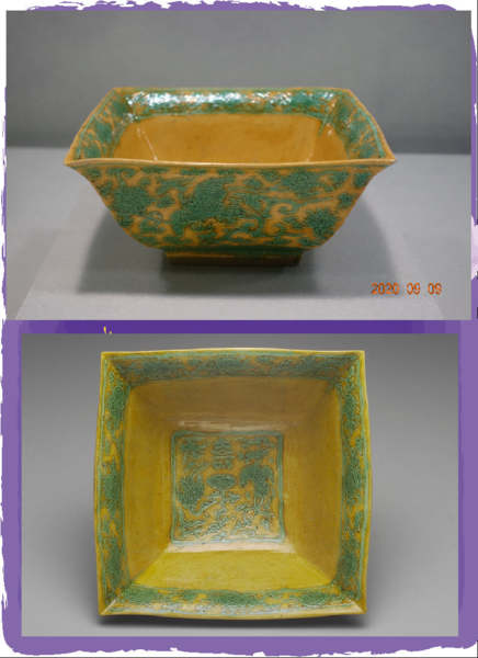 &明朝嘉靖年間,以彩色為底的瓷器盛行,而且配色都很活潑、鮮明,就像這件【嬌黃綠彩鳳凰紋方洗】,以嬌黃釉為地,再以綠釉彩突顯出錐劃紋飾的撇口方彩洗,便是這個時期相當典型的例子;器內底心飾有一鳳一鶴,中間則有靈芝及「壽」字篆書款,整體色彩非常鮮豔