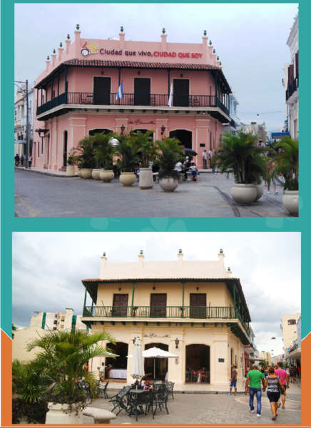 (上圖)旅館除了顏色不一樣之外,上面還多了一行標語--Ciudad que vivo, ciudad que soy我居住的城市,我所在的城市;這是卡馬圭市歷史學家辦公室(OHCC)領導的一場公益活動,目的是強調維護城市環境和文明的必要性!