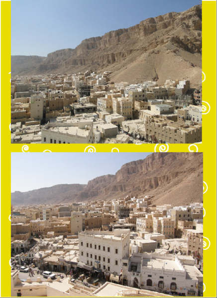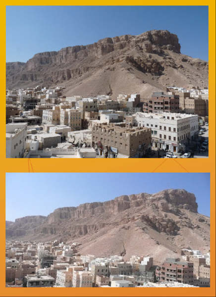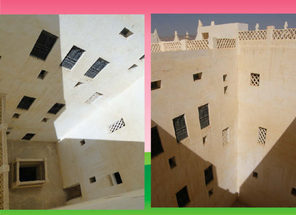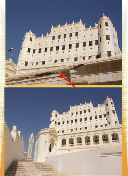 塞雲宮的建造使用 Hadramawt 地區傳統的建築技術和材料(石頭、草料和粘土)--上圖箭頭處可以看得很清楚