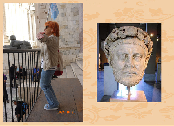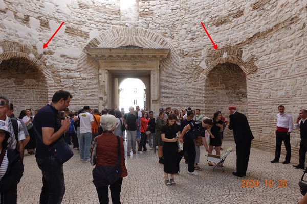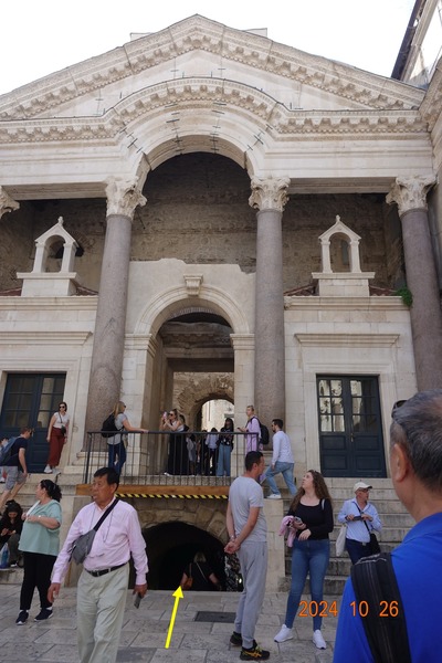左-嬌小的地陪為我們示範,當年戴克里先站在這,頭戴璀燦王冠、身穿掛肩金色長袍,接受子民對他的膜拜!