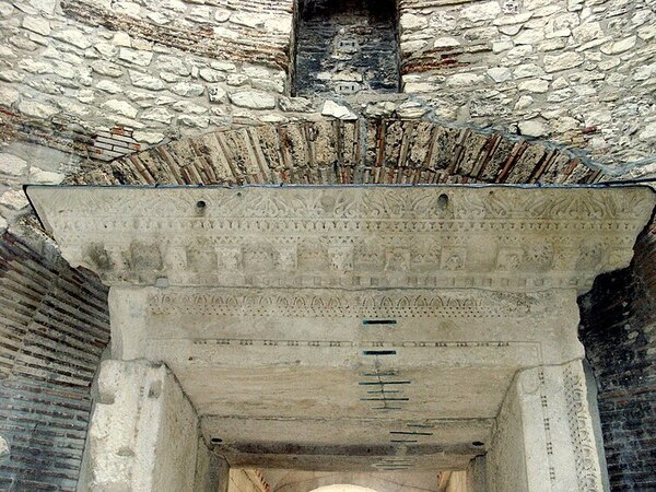 * 前廳的牆面原本貼有彩色鑲嵌畫及灰泥壁畫,現在看到內部的四個「壁龕」,原本立著四座雕像,代表著由戴克里先提出的「四帝共治」的羅馬帝國四位皇帝