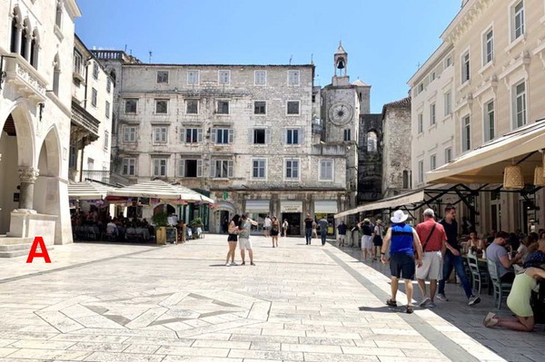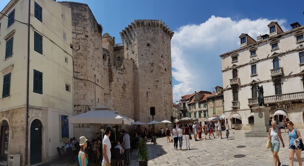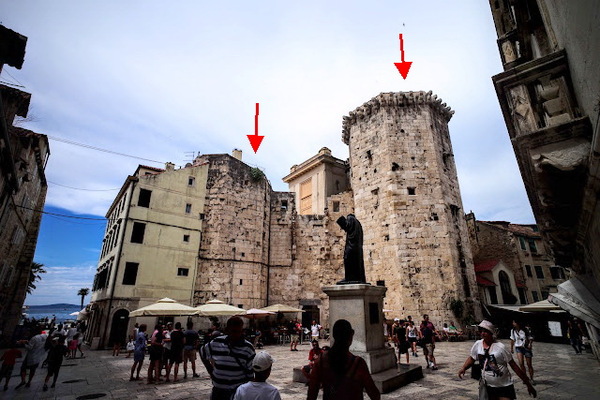 水果廣場上醒目的八角塔,是15世紀威尼斯碉堡殘留的部分,其中最大的(中央)塔樓和較小的東塔(左側)以及連接它們的南面城牆是今天僅存的遺跡 *網圖