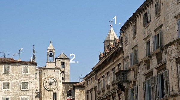 1是聖多米努斯大教堂的鐘樓(在城中央),2是金門的鐘樓(在北邊);人民廣場上的這座鐘樓和它們明明相隔了半座城池,看起來卻緊緊相依!