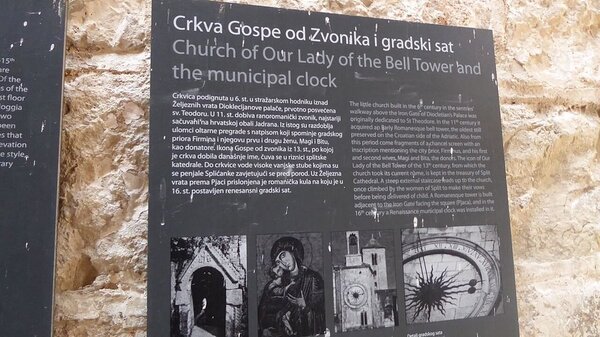 這張告示是在說--原本鐵門上有一個小教堂,是獻給聖西奧多的。鐘樓是11世紀建的,時鐘是16世紀裝的!