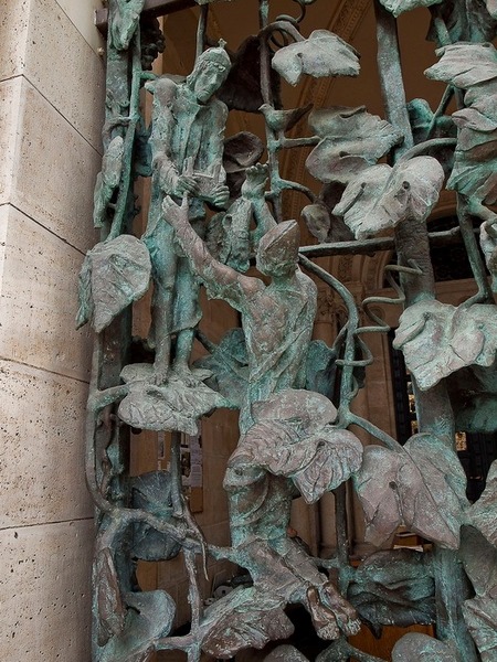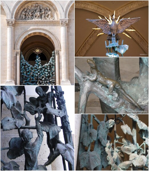 千禧門以象徵巴蘭尼亞地區的葡萄葉為主,其中還隱藏著聖經的場景(耶穌和聖彼得)和佩奇教會的歷史場景(聖斯蒂芬國王和佩奇主教博尼佩爾),以及眾多的動物圖案(滑龜、青蛙、蜥蜴、小鳥)。這座青銅紀念雕塑的頂部則是被金色光芒環繞的聖靈鴿子。