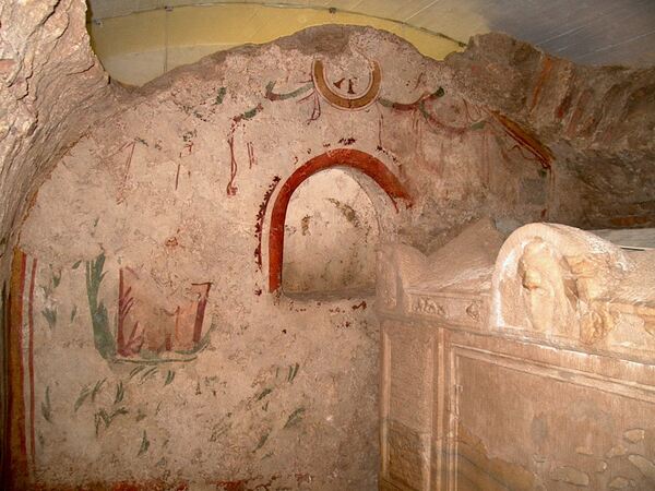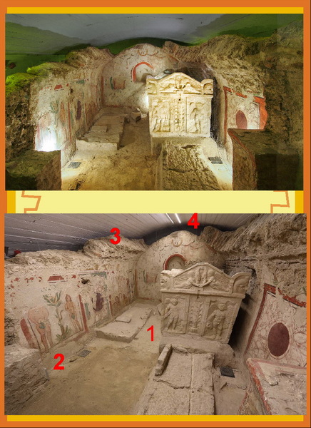 *這座墓地分為兩層:一層是用石灰岩建造的地下室和地下墓穴(cubiculum),死者被埋葬在石棺或磚砌墓穴中;頂層則是地上教堂(memoria)和陵墓!