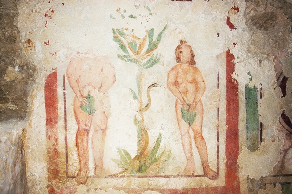 *牆壁上繪有仿大理石板和植被。花園的意象在早期基督教墓地中十分常見。可能與伊甸園有關。
