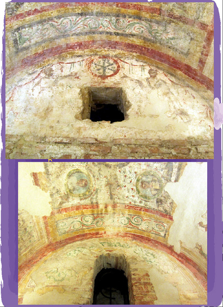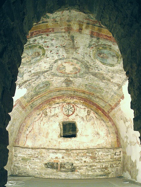 *在房間的北牆上,可以看到彼得和保羅的畫像,他們以讚美的姿勢指向基督圖【由希臘字母 X(khi)和 P(rho)組成】