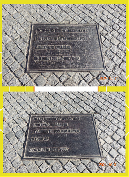 To the memory of the victims shot into the Dabube by arrow cross militiamen in 1944-45.Erected 16th April,2005 為紀念受害者在1944-45年間被箭十字黨射入多瑙河。建立於2005年4月16日。