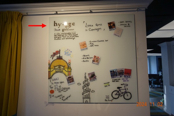 旅館休息區的牆上有一張海報,其中要特別注意的是〝HYGGE〞這個詞!