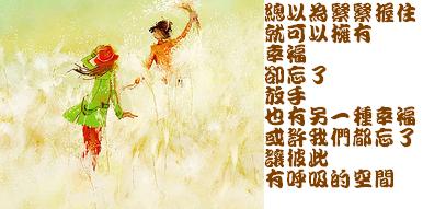 有時候在想~~快樂是自己要的;傷痛也是的;逐漸的我開始了解,幸福,是靠自己去領會及體驗!了解應該要學著尊重對方的感受及想法,不要一味地要求對方配合自己,或常想監控對方的行蹤,日子一久,對方也會覺得沈重的愛情令人無法呼吸,保持適當的距離讓對方擁有些許空間,對彼此的感情會更加溫。