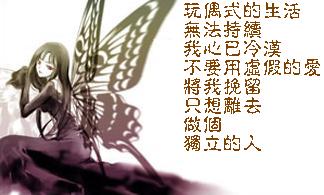 在讀完"易普生"的" 玩偶家庭 "......心中有很大的感慨,人總是無法完全為自己而活,常為了一些原因,改變自己的想法及決定。想起了阿Ching的婚姻生活,她說覺得自己像個傀儡般,被控制著去配合老公的喜好及要求,穿怎樣的衣服還有說什麼話及化怎麼樣的粧等等,還得上一些完全沒興趣的課程,剛開始以為找到這輩子的幸福,結果並不是她所想像那般,當小麗跟我說阿Ching已經離婚了,我倒是一點也不意外,女人阿~~~不要再當愛情玩偶了~~~「把線剪斷了吧!」