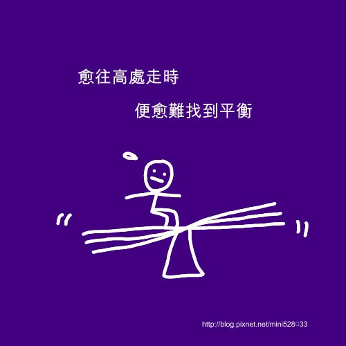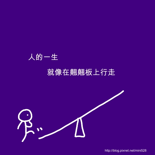 踮著腳尖走在翹翹板上晃呀晃呀人生像是走在翹翹板上往想要的人生前進但就是無法取得平衡在低處時我努力的向上走卻發現越來越困難爬到高處在顛峰時就必須捨棄些東西你呢~~~你平衡了嗎?