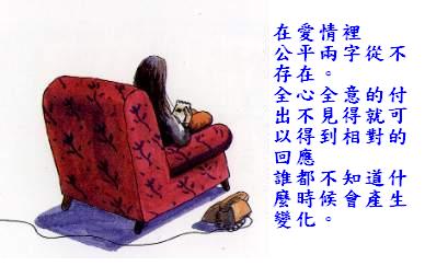 「我跟你說喔,感情的事發展到最後真是難以預料!在愛情裡,公平兩字從不存在。全心全意的付出不見得就可以得到相對的回應,誰都不知道什麼時候會產生變化。當然沒有人喜歡被背叛;如果不想嚐到被愛情背叛的滋味,首先要先學會如何不背叛別人,也不要將自己一時的快樂建築在別人的痛苦上。」