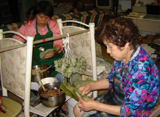 ( 婆婆和小姑包肉粽的專注神情 及 成品 )