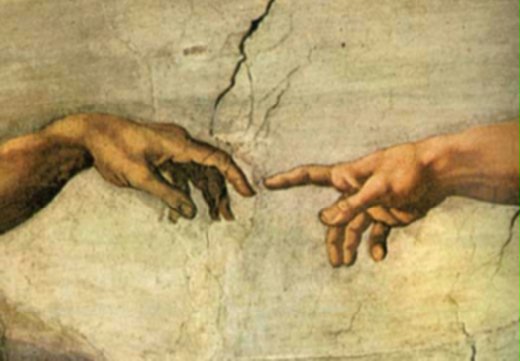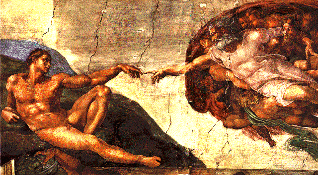 畫中所呈現的,正是上帝在修塑出亞當的形體後,以右手為亞當灌注靈魂與力量的一刻,這是上帝造人的剎那,在基督教中,這就是人類起源的由來。