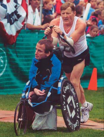 記得在我看的短片中, 爸爸Dick Hoyt 說兒子Rick 是他們這團隊的心臟, 他是身體. 他們絕不單獨比賽. 他為了幫助兒子完成心願, 練習長跑, 學游泳, 一步一步不斷地跑, 無怨無悔地成為兒子的身體.