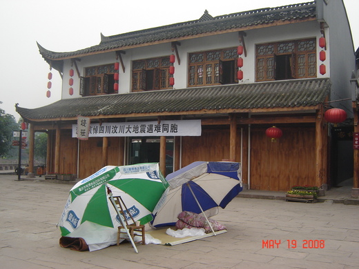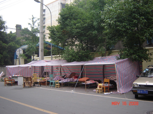 電視裡二十四小時不斷報導﹐震區災情和救援情況﹐觸目驚心﹐感同身受﹐不幸的一個個讓人心痛又心碎的故事和畫面. 幸運被救出的一個個讓人感動的經過... 幾乎讓我不忍再看下去. 我們的心情一天比一天沉重。 餘震不斷﹐成都市馬路兩邊搭了許多帳篷和臨時棚子﹐一些空曠的地方到晚上也都擠滿了人。 附近的華西醫院不斷有救護車進出﹐別的省市的救護車﹐救援車也到處可見。