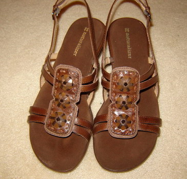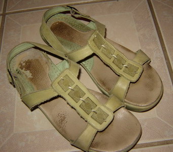 再多看看這鞋幾眼,很面熟哩?! 原來是和幾年前回臺時帶回來的一雙涼鞋造型很像。 那是我和爸媽去一家要關門的鞋店買的一雙舒適的淺綠色涼鞋。 幾年下來已經被我穿得差不多了。 那雙涼鞋則是媽媽買給我的。